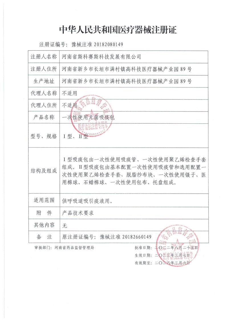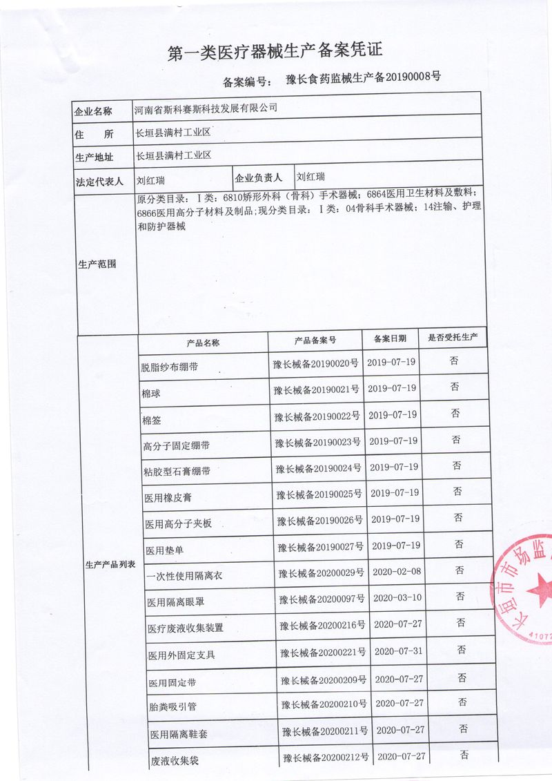 河南省斯科賽斯科技發展有限公司創建于 2011 年,位于“中國醫療耗材之都”- 河南省長垣縣,西臨 308 省道,南靠新菏鐵路,北依長濟高速,交通便捷,經濟發達,環境優美。斯科賽斯積極進入醫療健康和服務領域,秉承為用戶創造價值的理念,專注于醫用耗材解決方案的研發和運營,并為用戶提供完善的產品解決方案;  斯科賽斯主要生產醫用麻醉系列、醫用高分子系列、醫用敷料包系列、醫用無紡布系列、醫用防護系列、醫用脫脂棉系列、生物材料制品類等七大類、100 多個品種、400 多個規格的產品。公司占地面積約 30000 平方米,建筑面積20000 平方米,擁有 10 萬級的凈化車間總面積 10000 平方米。擁有國際先進水平的生產設備和檢測儀器,技術裝備精良,檢測手段完善,為醫療行業的不斷發展進步提供保障。公司順利通過 ISO9001、ISO13485 質量管理體系認證。  斯科賽斯堅持研發高科技新產品,力爭在醫療器械關鍵領域取得技術和研發的重大突破;立足國內和國際兩個市場,逐步實現管理理念、經營機制、人力資源、技術、產品、市場等全方位對接,提高企業的核心競爭力;過去的歲月里,斯科賽斯砥礪前行,誠信務實,銳意進取,不斷創新,用自己的睿智和辛勞,以富有責任感的使命,在探索中追求,在追求中超越,致力于成為值得信賴的醫療用品生產企業!在未來的日子里,斯科賽斯將一如既往豪情滿懷,信心百倍,攜手并肩,執著追求,向更高的的目標前進,鑄造新的輝煌!